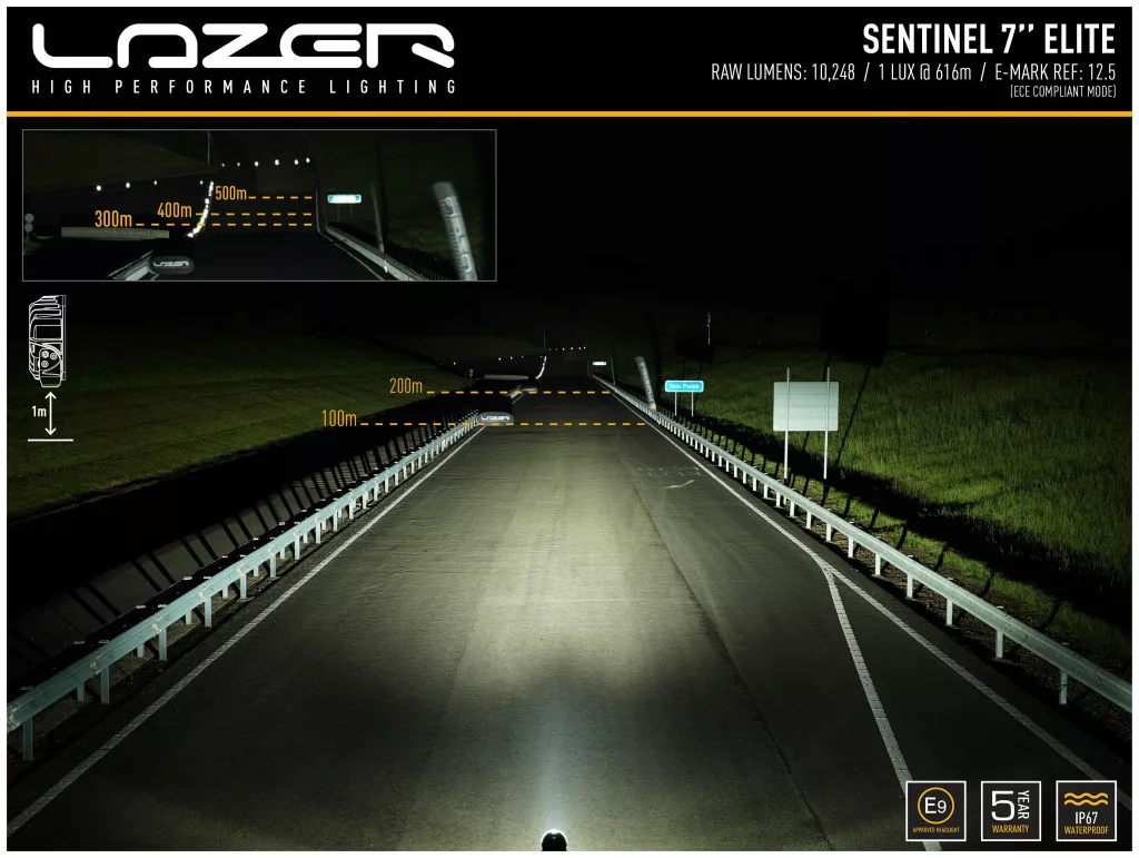 A Lazer Sentinel 7' Elite Parklight a Sentinel sorozat új 7'-es kollekciójának legerősebb változata, amely sok dicséretet kapott a profi vezetők körében. A Sentinel sorozat ötvözi a stílusos dizájnt és a csúcskategóriás teljesítményt anélkül, hogy kompromisszumot kötne a jól ismert Lazer minőség terén. A Sentinel 7' Elite modell 24 nagy teljesítményű LED-del van felszerelve, amelyek hihetetlen mennyiségű fényt hoznak létre. A gyártó által a lámpához megadott fényáram óriási 10248 lumen, és ez önmagában kiemeli a többi konkurens termék közül. A maximumra állított fényáram a hatékonyan tükrözött, vákuumos fémezett reflektorfelületekkel kombinálva kellemes kombinált fénysugarat hoz létre, amely hatékonyan világítja meg az út szélét és a messze előttünk is. A lámpa deklarált hatótávolsága 616 méter @ 1 lux! Két lámpával a fénysugarak egymás mellé vagy egymásra irányíthatók, így a kívánt világítást kaphatod. Ennek a modellnek a különlegessége a parkolólámpa funkció, amelynek színe hagyományos fehérre vagy szemet gyönyörködtető narancssárgára állítható. Méretükből adódóan a Lazer Sentinel 7' sorozat lámpái a legalkalmasabbak mind a személygépkocsik, mind a nagyobb SUV-k elejére.