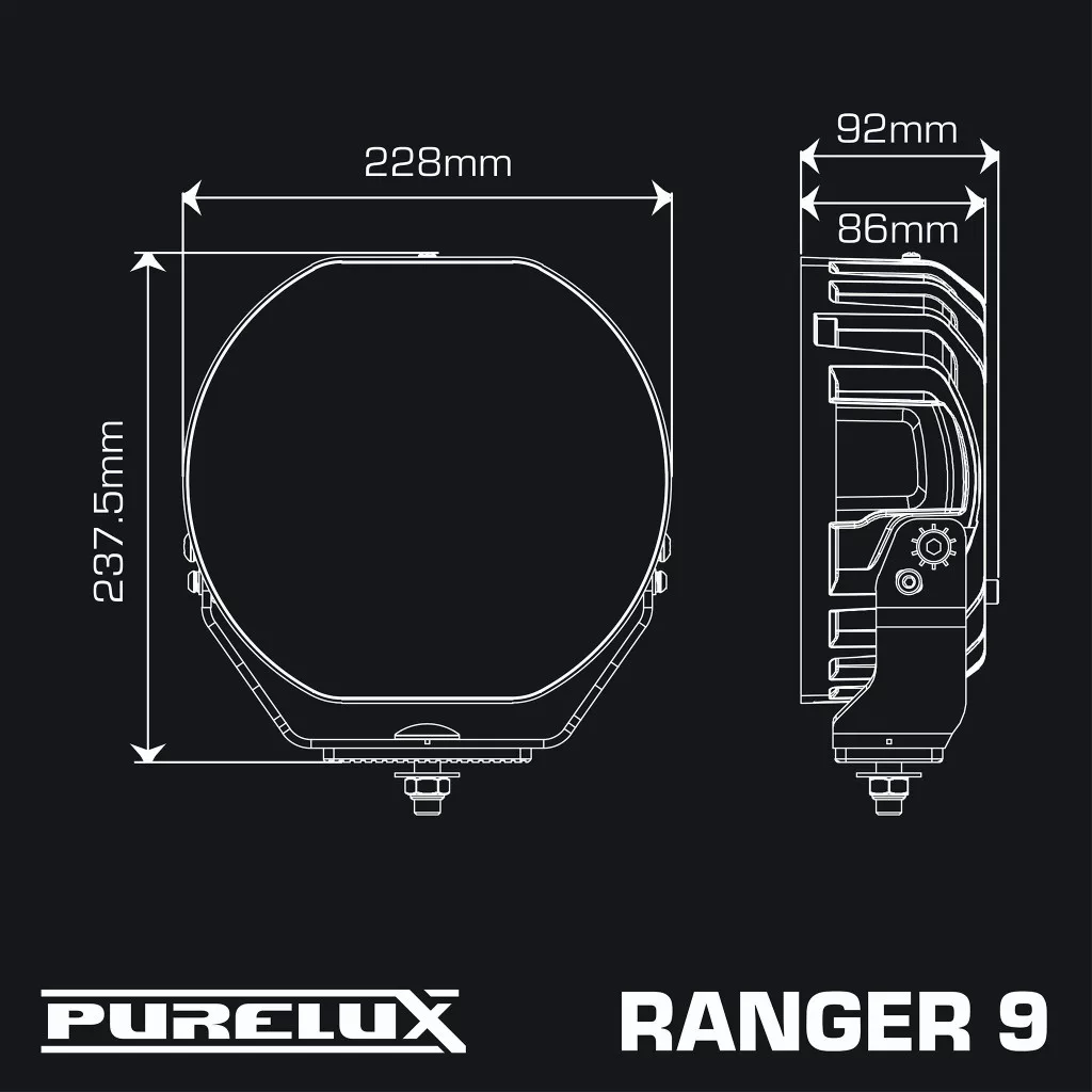A Purelux Ranger 9 egy feltűnő és nagy teljesítményű 9"-os kiegészítő lámpa, amelyet kifejezetten terepjárók, furgonok és nehézgépek igényeihez terveztek. A lámpa többek között nagyon nagy teljesítménnyel, két különböző teljesítménymóddal, R65-ös jóváhagyással rendelkező figyelmeztető lámpával, dinamikus parkolófénnyel és lenyűgöző dizájnnal van felszerelve - más szóval mindennel, amire egy kiegészítő lámpától szükség lehet. Magasztos nevéhez méltóan hatalmas, 11632 lumenes fényerőt produkál korlátlan PowerBoost® módban, és lenyűgöző fénysugarat hoz létre, amely akár 840 méterig is el tud érni (@ 1 lux). Bár a járőrökről köztudott, hogy nem kell tartalék, a fényerő és a fénysugár még tovább növelhető, ha két vagy több tisztet szerelnek a jármű tetejére vagy elejére, hogy egymás mellett járőrözzenek.