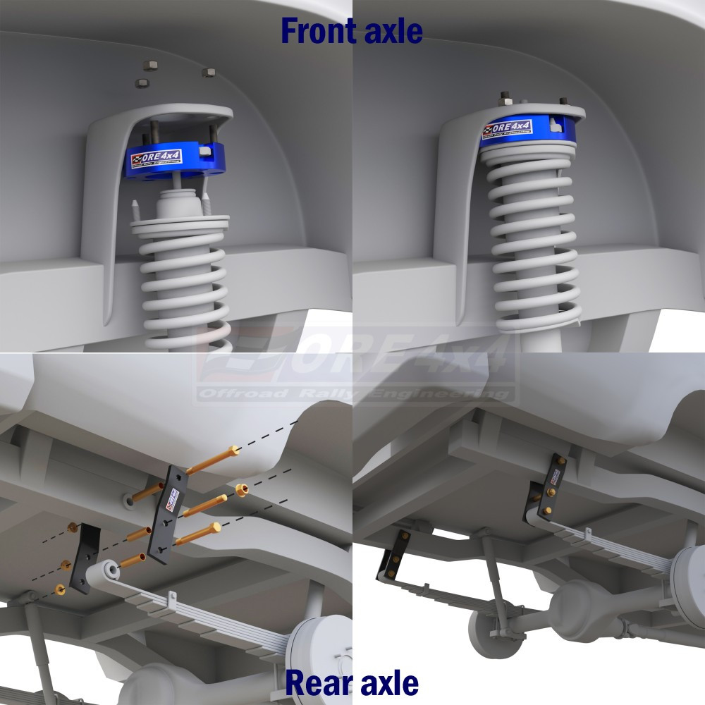 Az első távtartókat a McPherson rugóstag felső rögzítése és a jármű karosszériája közé szerelik be. A hátsó laprugókat hosszabb bilincsekkel szerelik fel, a hátsó lengéscsillapítókat pedig a készletben található hosszabb lengéscsillapítókkal cserélik ki.