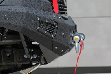 Přední nárazníky More 4x4 pro off-road jsou ošetřeny stříkáním s projektily, elektromotorickým nástřikem zinku a poté jsou pokryty práškovým nátěrem Sahara s vyšší odolností proti opotřebení a strukturální barvou Pękana Pustynia.