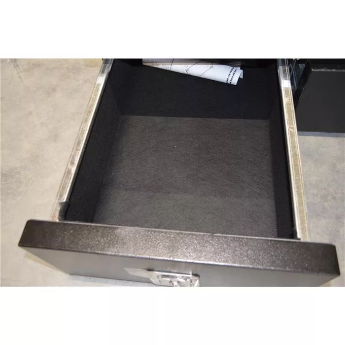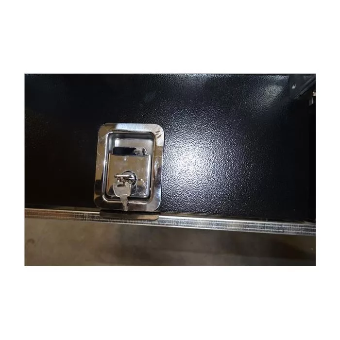 A TÁROLÓ FELSŐ RÉSZE VÍZÁLLÓ RÉTEGFÁBÓL KÉSZÜLT, FEKETE SZŐNYEGGEL BORÍTVA. AZ ÉLEK ALUMÍNIUM SAROKVÉDŐVEL VANNAK VÉDVE A SÉRÜLÉSEK ELLEN.